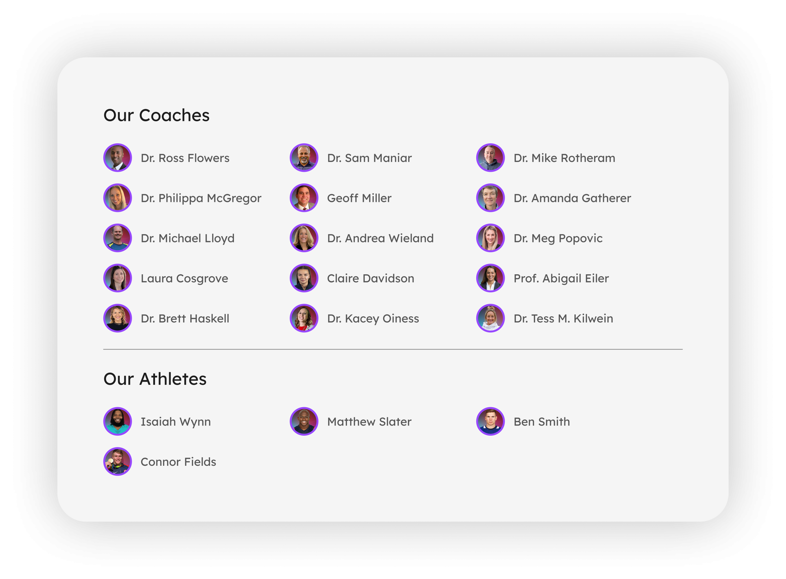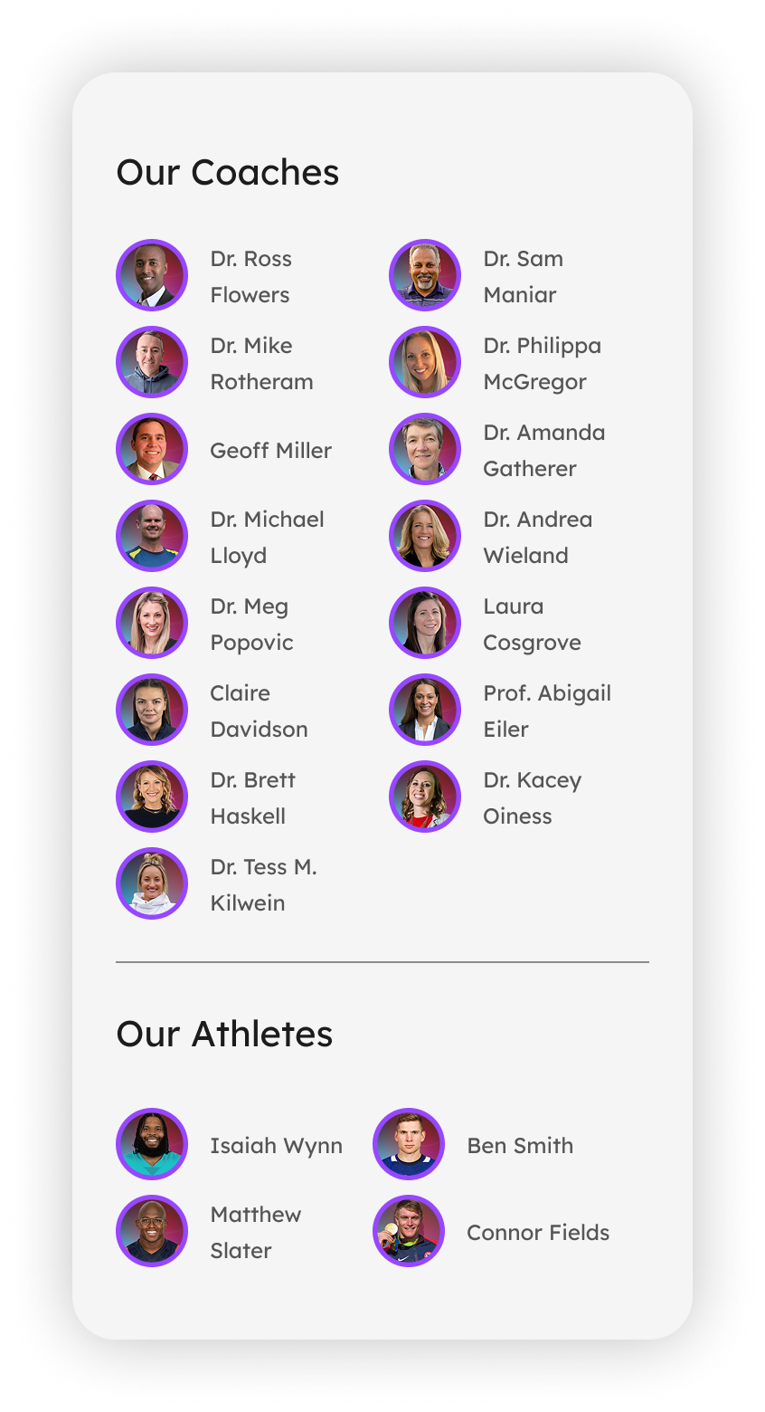 Our coaches bring decades of elite experience, contributing to Olympic Games, World Championships, and major leagues like the NFL, MLB, NBA, and the NHL.